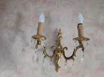 Lot d’appliques murales anciennes, style classique. Le lot comprend 3 pièces : – 2 appliques simples – 1 applique double structure en métal doré avec