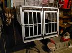 Hondenbench voor auto. Breedte 94 cm, diepte 87 cm en hoogte 69 cm. Gaat achteraan schuin af zodanig deze volledige tegen de achte