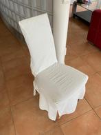 6 eetkamer stoelen, met overtrekken. Overtrekken werden gemaakt omdat de originele bekleding sporen van gebruik begonnen vertonen (zie foto’s). Grijze metalen poten, de stoelen zijn nog steeds stevig.