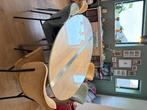 Table de salle à manger avec plateau en chêne massif avec bande centrale en acier inoxydable et pieds en acier inox + plateau en verre sur mesure qui peut être enlevé. Longueur 220cm largeur 120cm hau
