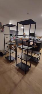 Tv meubel en 2 hoge meubels met glazen leggers, het frame is zwart gepoedercoat, de onderste en bovenste leggers in donkerbruine h
