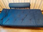 Zetelbed/slaapbank voor 1 persoon. Metalen frame en blauwe bekleding. 1M87 lang en 81cm breed. Met rugleuning voor wanneer je het als zetel gebruikt. Zijkanten kunnen naar omhoog. In goede staat.