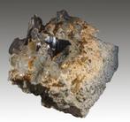 Twee zéér zeldzame mineralen op één stuk: hemelsblauwe borcariet kristallen + één goudgeel roweiet kristal, gedeeltelijk ingebed i