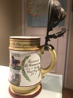 Chope d'un demi litre, en porcelaine, hauteur 20cm, avec aigle en étain sur le couvercle, dessins et textes en allemand, ayant