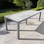 Table d’extérieur / de jardin 90x230 pieds aluminium : 5 pieds dont 1 central, réglables avec roulettes. Très bon état. Plateau :