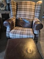 Magnifique fauteuil avec pouf en cuir, encore à l'état neuf. Disparu en raison d'une refonte complète de l'intérieur. Légères traces d'usure sur le pouf.