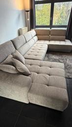 Zetel te koop (goede staat) • stof • beige-grijs • inclusief 4 kussens • alle bovenstukken kunnen naar beneden of naar boven geklapt worden • achterkant lengte: 380 cm •