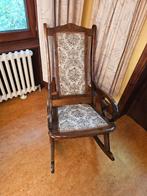 Prachtige spaanse schommelstoel in tropisch hout, glanzend. Bovenaan steekwerk. Rug, zit en achterzijde: antiek geweven stof met gouddraad afgeboord. Stof in onberispelijke staat. Afmetingen: 95 cm ho