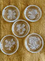 5 sous-verres vintage en verre découpé, décoration florale en cristal incolore, marqués val saint lambert, pas de boîte d'origine, comme neuf, taille : ⌀ 9,5 cm, hauteur 1,4 cm, à retirer et à pay