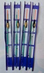 6 zelfgemaakte vislijntjes lange, smalle dobbers van 17 cm - berteyn a. (5X): 2 x 0,75 gr en 3 x 1 gr - van den eynde (1x): 4 x 16 nieuwe schuiflatjes van 26 cm (kostprijs €1/stuk) ronde loodjes