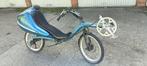 Blauwe ligfiets met bagagebak. Merk : stinger er zijn 8 fietsversnellingen aanwezig. Afmetingen: lengte = ongeveer 200 cm hoogte = ongeveer 90 cm breedte = ongeveer 55 cm de afstand van de trappers te