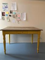 Leuk houten bureautafeltje. Met schuif. En gele onderkant. Hoogte 75 cm breedte 115 cm diepte 74 cm veel gebruikt. Veel van genoten. Wie geeft het een volgend leven?