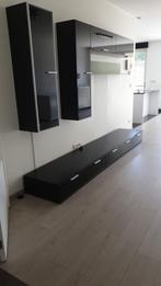 Tv wandmeubel met 1 verticale hangkast met verlichting 1 l vormige hangkast met een boekenplank 1 kast met twee lades voor op de