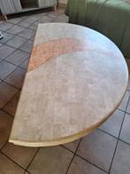 Salontafel in travertin vintage salontafel in travertin, met sierstuk. Vraagprijs 350 euro.halve ronde: diameter breedte 75 cm, lengte 120 cm.hoogte 42 cm. Kan opengedraaid
