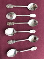 Antieke zilveren lepels met verschillende bloemmotieven, 6 stuks, met gegraveerde tekst: prima ns.alp., Het cijfer 6 en nog een klein symbool dat ik niet herken. Splinternieuw, nooit gebruikt. Lengte