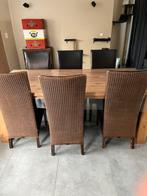 Houten massieve tafel met zes stoelen stoelen hebben gebruiksporen
