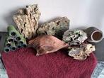 Verschillende decoratie stukken. Rotsen, 1 van 22×18 cm, 1 van 24×15 cm, 1 van 20×9 cm, 1 van 8+10 cm. Stuk hout van 25×15 cm. Hol