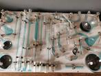 Ophangbord met labomateriaal, exelo., Sovirel france. Driehals rondbodem kolf heeft beschadiging aan één hals. Zie foto's.