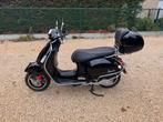 Vespa zwart 125cc in quasi nieuwstaat, slechts 308 km gereden sinds inschrijving in maart 2022, extra voorzien van chrome valbeugels en topkoffer met kussen. In topstaat!