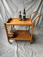 Houten serveerwagen met uitneembaar dienblad met een draaibare flessenhouder uitgevoerd met verchroomde handgreep in goede vintage staat met torck ste