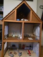 Handgemaakt poppenhuis op wieltjes met popjes en meubilair. Hoogte 125cm, breedte 85cm, diepte 45cm. Handgemaakte houten wieg. Hoo