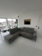 Fauteuil d'angle en tissu gris. Un côté de 2,30 m de long, l'autre de 2,68 m pattes noires, fines et solides. Idéal car vous pouvez passer l'aspirateur en dessous. Coussins ajustables marq
