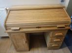 Bureau vintage avec volet. L'ancien vernis a été retiré sur le bois de hêtre nu. Avec 1 armoire et 3 tiroirs. Au dos du bureau, plusieurs poches s