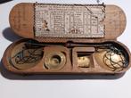 Antiek 18e-eeuws frans muntweegschaaltje (ca. 1760–1785) Origineel muntweegschaaltje met balansarm en twee messing schaaltjes, gebruikt voor het wegen van gouden en zilveren munten. In het deksel bevi