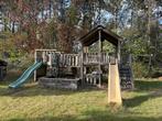 Speeltuig met 2 glijbanen, buitenkeukentje, klimwand, zitbank,… zelf af te breken! Zit niet in de grond maar in stalen pinnen (zie