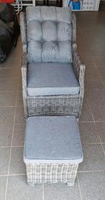 Mooie tuinstoel met verstelbare rugleuning en een voetenbankje gemaakt van grijzige wicker rond een licht aluminium frame met dikke zachte grijze kussens merk: bois le duc is nog zo goed als nieuw, he