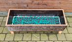 Hooibak gemaakt voor klein vee bak van betonplex is 90cm op 31cm en 22cm hoog staat op schuine poten (makkelijker om uit te eten) hoogte vooraan: 31cm hoogte achteraan: 37cm in de bak ligt een hooinet