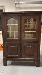 Meuble de salle a manger en bois massif de couleur marron avec 2 portes vitrées teintées jaune et 2 portes basses pleines tablette en verre (1 coin cassé) plusieurs griffes quelques taches à l’intérie