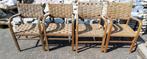 Largeur : 52 cm. Profondeur : 50 cm. Hauteur d'assise : 40 cm. Hauteur accoudoirs : 64 cm les boiseries ont été traitées contre les parasites. Les cordages sont à refixer. Une seule est en bon éta
