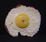 Keukenklok in de vorm van een gebakken ei : in reliëf en is gans vervaardigd in hard polyresin , volledig handbeschilderd met een wandbevestiging aan de achterzijde en werkt op een aa batterij , is ni