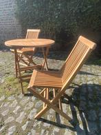 Table pliante ronde diam 80 avec 2 chaises pliantes en teck, vendues séparément ou séparément, table 125€ et les deux chaises 100€