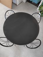Diamètre 100 cm comme neuf. Monture en métal. Lame en mélamine solide et robuste avec finition métallique sur tout le pourtour. Les chaises sont assor