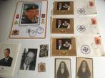 Verschillende zaken van belgisch koningshuis: - afgestempelde postzegel overlijden koning boudewijn op a4 - 2 herdenkingskaartjes overlijden koning boudewijn - kleine foto boudewijn bloemenneerlegging