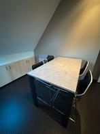 Prachtig bartafelset met 4 leder stoelen. Mooi grijs tafelblad met structuur in. De stoelen zijn van zwart leder en 1 stoel heeft