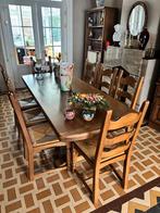 Stoelen zijn 30 jaar oud, enkel gebruikt bij gelegenheden. Nog steeds goeie kwaliteit en zeer stevig. Zitting in riet. Tafel wordt
