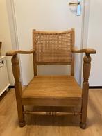 Mooie blankhouten armstoel. Met onlangs vernieuwde rieten rugleuning. Afmetingen: hoogte 78cm, breedte 58cm, diepte 60cm.