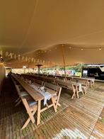 Op maat gemaakte houten tafels met inklapbare poten voor op te bergen. (Gebruikt op onze trouw) tafels: afmetingen: 320cm x 90cm 1x vernislaag banken: 130cm breed 1x vernislaag kussens mee te koop (li