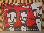 « vegas copa » — sur toile de herman brood peinture expressive et énergique, clairement inspirée du style d'herman brood. L'œuvre montre trois visages de style abstrait aux couleurs contrastée