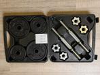 Nieuwe halterset van 20 kg. Ongebruikt, nog niet uit de verpaking geweest! Deze 2 korte halterstangen en 12 gewichten (8x1kg + 4x2 kg) zitten voor het gemak in een koffertje. Veiligheid verzekerd met