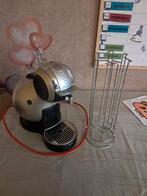 Dolce gusto + cuphouder (nieuwprijs 24€) 5 jaar oud niet veel gebruikt (draai knop voor tasvolume geeft soms kuren ) maar werkt perfect