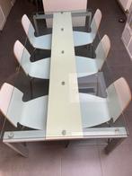 6 witte stoelen. Lichte gebruikssporen. U krijgt er een glazen tafel bij, gratis! Tafelpoten zijn helemaal gedemonteerd om op te h