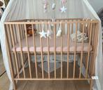 Mooie houten babybox (90 x 100 cm) te koop, inclusief matras. Inbegrepen: ✔ 2 matrashoezen (wit en roze) - zo goed als nieuw ✔ 2 witte moltonhoezen - nieuw ✔ 2 hoogtes verstelbaar enkel de box wordt v
