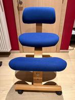 Houten bureaustoel op wielen met blauwe stoffen bekleding, in perfecte staat. Perfect voor wie regelmatig z'n zithouding wil w