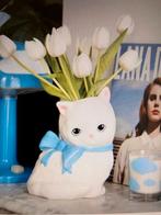 Witte vaas uit keramiek in de vorm van een witte poes met blauwe strik. Nieuw ongebruikt exemplaar in de originele verpakking van