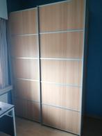 Schuifdeurkast in beuk met 2 deuren en afwerking met zilveren profiel. Zowel in linker- als in rechterhelft bevinden zich 2 legplanken bovenaan + hanggedeelte. Bij 1 helft is er ook nog een legplank o