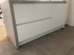 Kookeiland b: 80 cm h: 91 cm l: 208/175 cm keukenblad: 4 cm deuren: alpin wit mat keukenblad: betongrijs 4 kasten (d: 16cm) 1 keuk